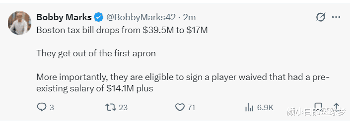 绿凯也成功从第一奢侈税征点上下来了,更关键的是,他们有资格裁掉一位球员,该球员此前的薪水为1410万美元。